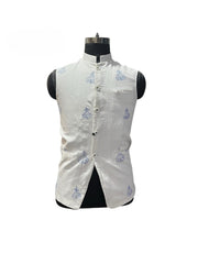 Men’s White Embroidered Nehru Waistcoat with Blue Motifs