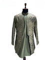 Exuding timeless sophistication, this green shrug kurta set blends intricate craftsmanship with regal charm. The shrug is tailored in a rich woven fabric featuring floral and paisley-inspired patterns, enhanced with a hand-embroidered motif on the shoulder for added elegance. Its structured silhouette, clean mandarin collar, and fabric-covered buttons make it a refined choice for celebratory occasions. Paired with a coordinating kurta and bottoms, this ensemble strikes the perfect balance between tradition and contemporary style.