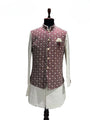 Make a sophisticated statement with this maroon / white shrug kurta set. The shrug features an all-over geometric motif in contrast white embroidery, highlighted with statement buttons and a crisp pocket square for added elegance. The white kurta underneath carries subtle textured detailing, creating a seamless balance of tradition and modernity. Perfect for weddings, festive events, and special celebrations, this ensemble exudes refined charm and timeless appeal.
